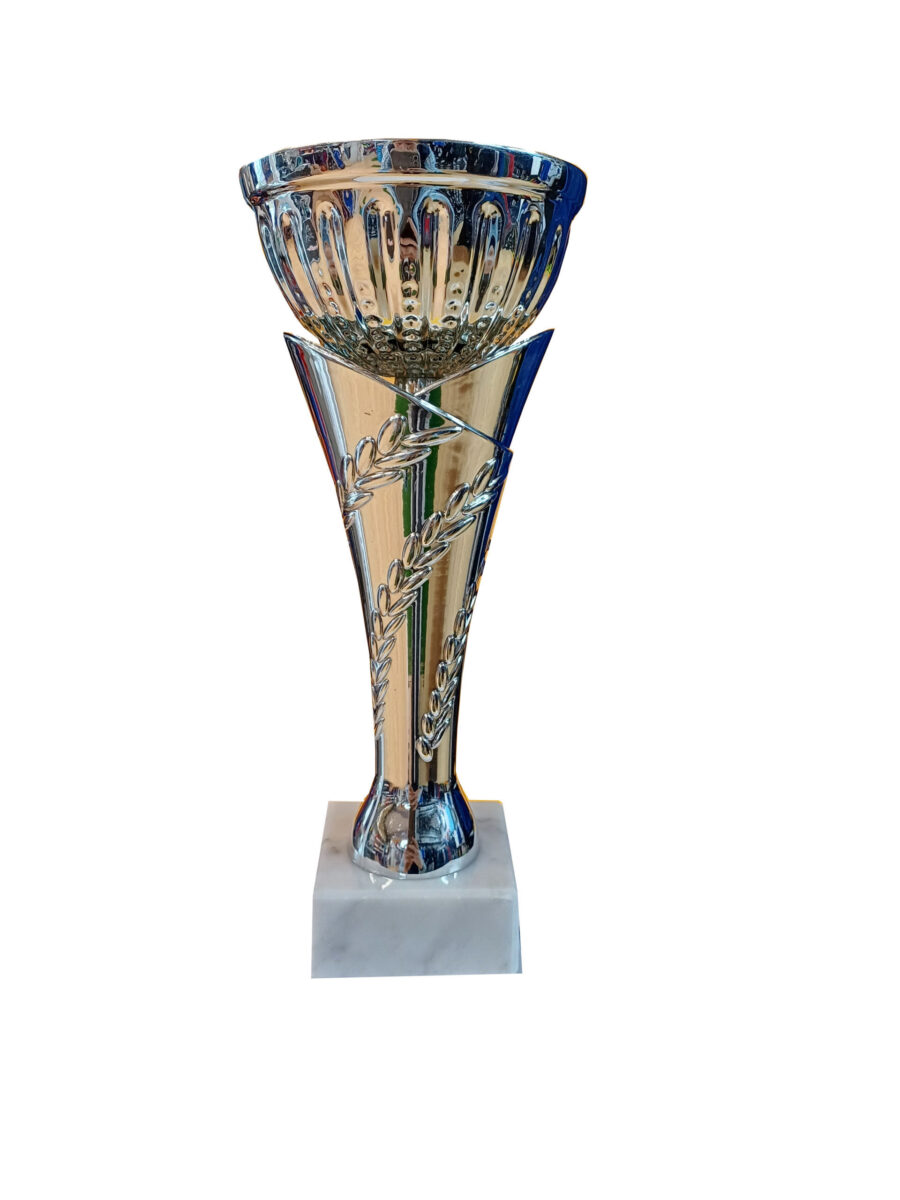 Trophy for all types of competitions, in silver, base in beige, height 34.5 cm, fi 14 cm.