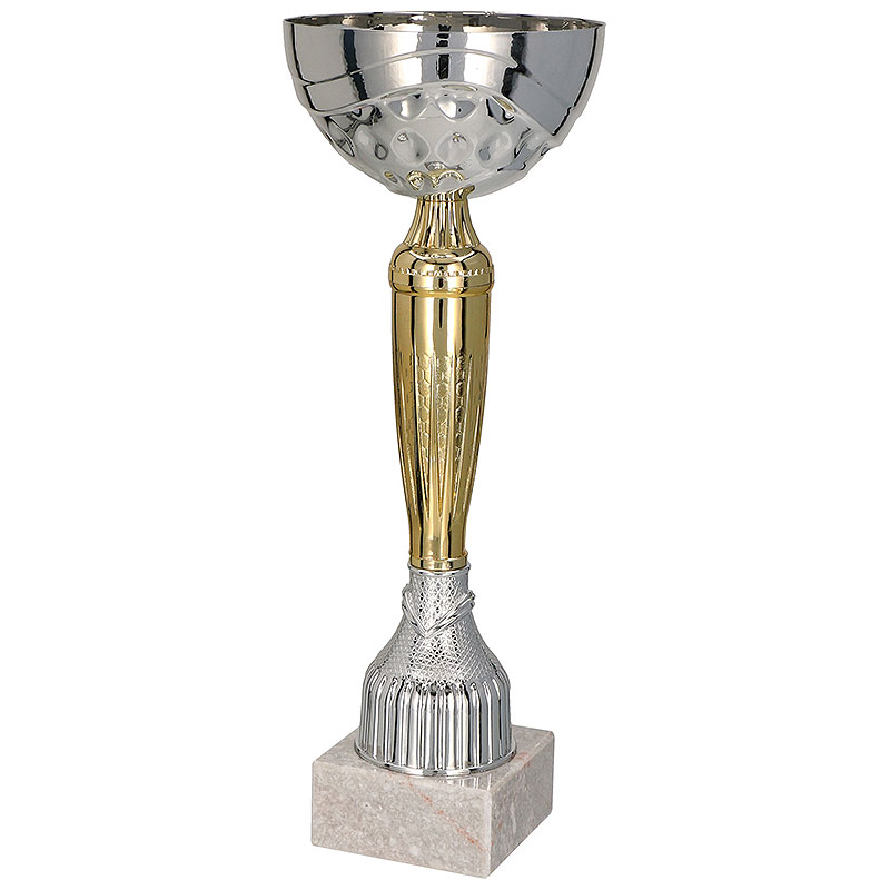Cup for all types of competitions, in gold-silver color, pedestal in beige, height 34.5 cm, fi 14 cm.