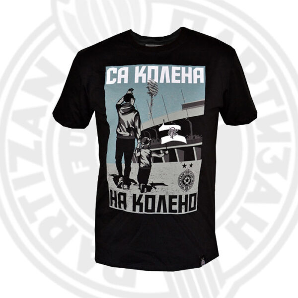 Crna majica s printom sprijeda, što je ilustracija dvije generacije partizanskih navijača.
