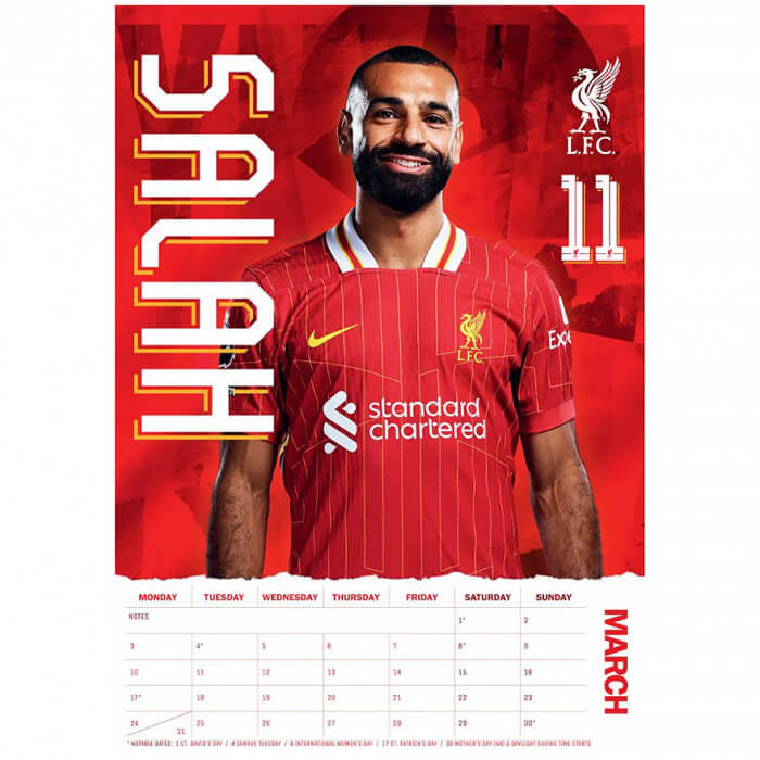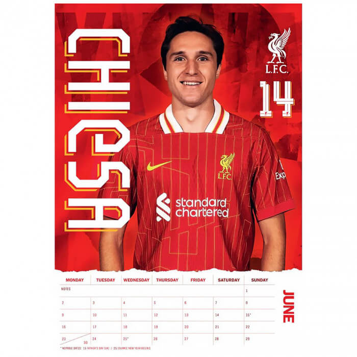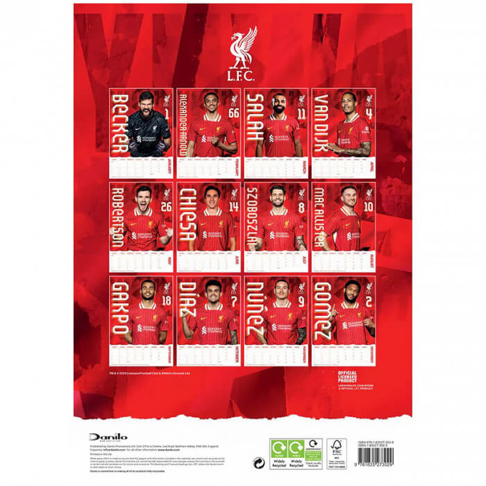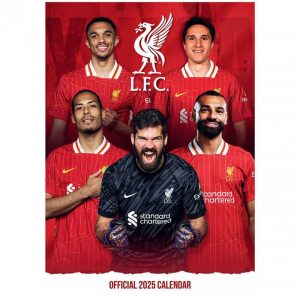 Kalendar Liverpool FC 2025 u A3 formatu. Ovaj kalendar savršen je za svakog navijača Liverpoola jer sadrži slike igrača trenutne momčadi i dovoljno prostora za sve vaše bilješke i sastanke u velikim mjesečnim datumskim okvirima.
