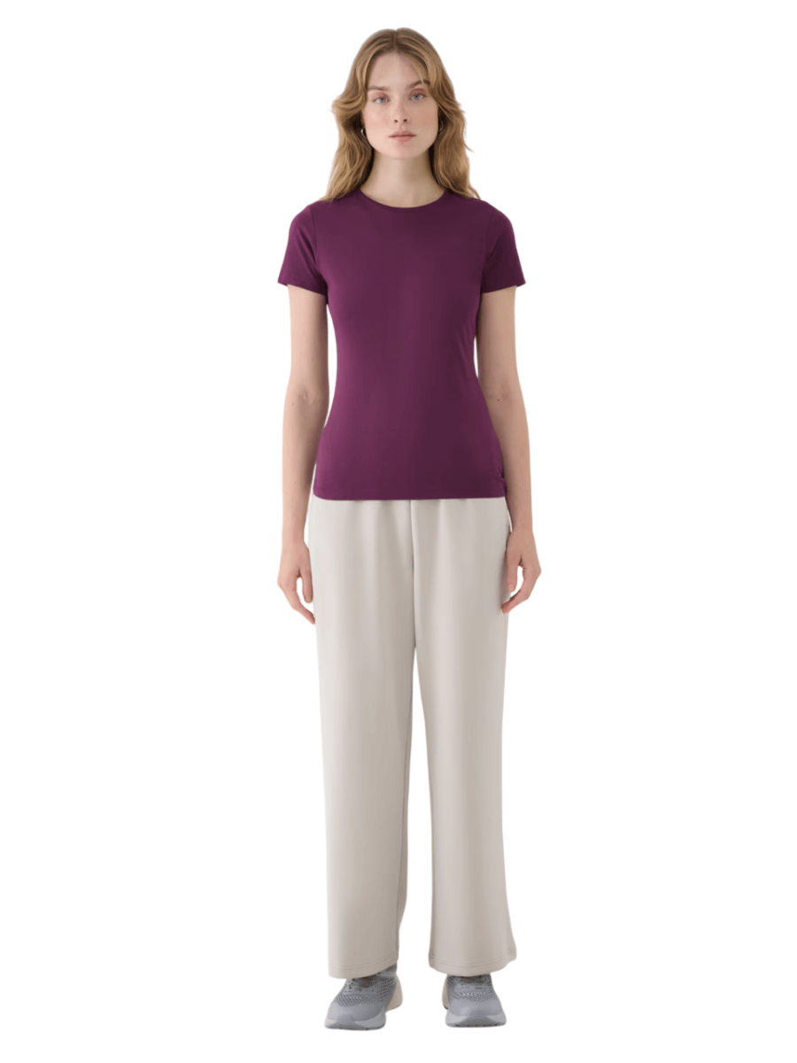 4F ženska kratka majica, ima ozek kroj, ki se prilega telesu in standardno dolžino, ki sega do bokov.
