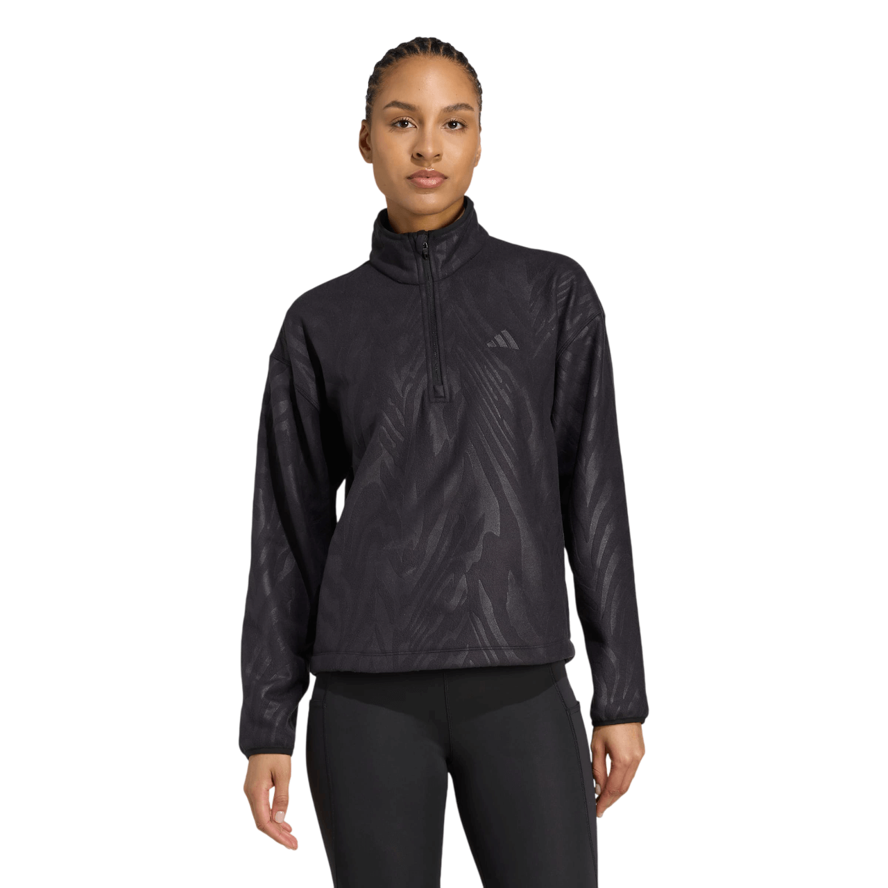 Mehak in udoben je iz flisa z vzorcem v tonu barve in skrajšanim krojem.