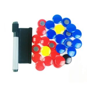Vključuje kavlje za obešanje, 2 kompleta magnetov- za dve ekipi (27 magnetov), ​​2 markerja za suho brisanje in 1 radirko.