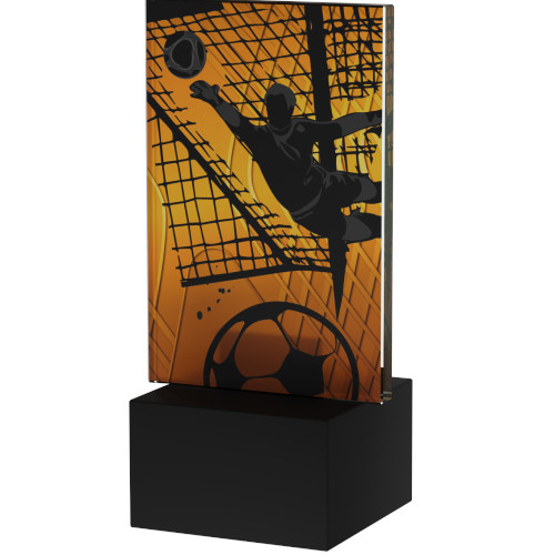 Steklena plošča s tridimenzionalnim barvnim tiskom. Vse skupaj je postavljeno na kamniti podstavek.